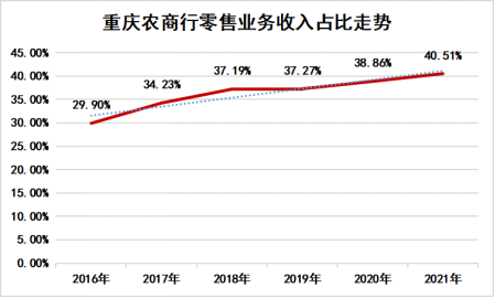 貸款規模的持續增長(zhǎng),帶動瞭(le)零售業務的業績貢獻度。2021年末,該行零售業務收入占比突破40%,達到40.51%,同比提升1.65個百分點,也實現瞭(le)連續5年遞增。零售業務營業利潤占比56.47%,連續3年位居全行首位。