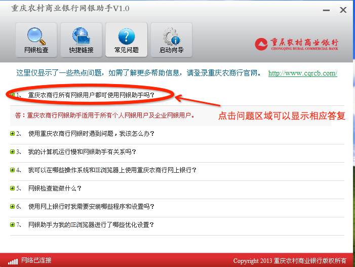 4.點擊菜單欄的“常見問題”按鈕,可以進入常見問題界面,如下圖所示,可以幫(bāng)助您解答一些常見的問題,如果還不能解決您的問題,請撥(bō)打我行客服電話95389尋求幫(bāng)助: