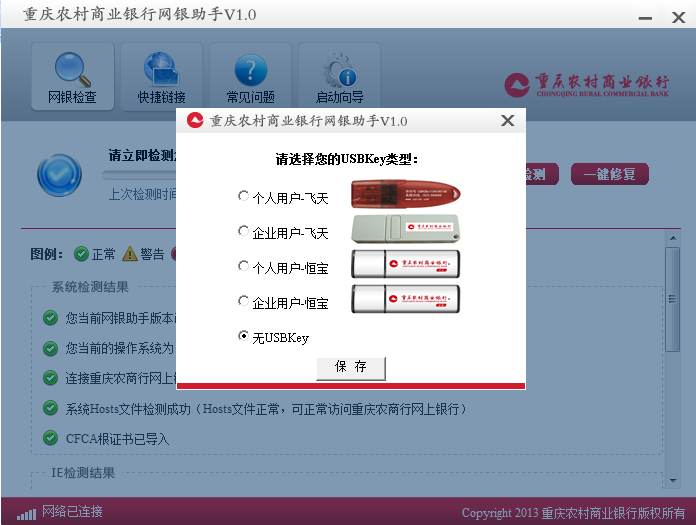 1.首次運行網銀助手,網銀助手會自動啓動用戶向導,如下圖所示,選擇合适的USBKey類型,並(bìng)點擊保存,如果沒有USBKey,請選擇“無USBKey”,如果以後需要修改USBKey類型,請點擊菜單(dān)欄中的“啓動向導”按鈕重新設置: