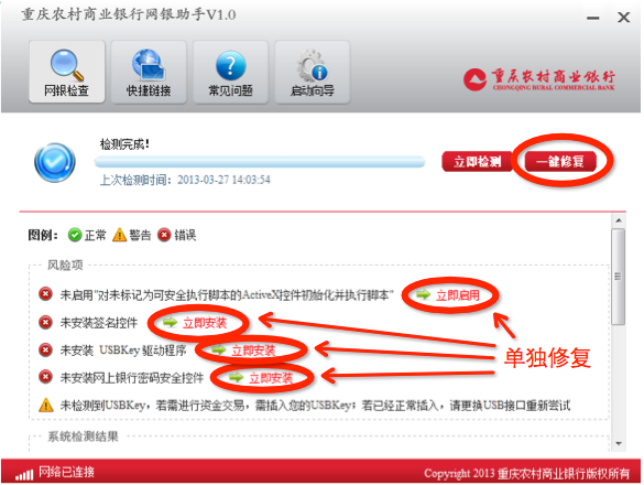 2.網銀助手登錄後會自動檢測(cè)您的電腦環境是否符合我行網上銀行,如下圖所示,如果發現有風險項,請可以點擊“一鍵修複”按鈕進行全部修複,也可以選擇其中部分檢測(cè)結果進行單(dān)獨修複;點擊“立即檢測(cè)”按鈕可以重新檢測(cè)您的電腦環境: